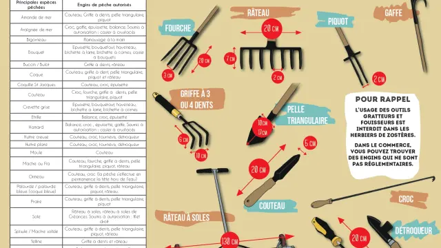 Chaque outil (présenté dans le prospectus ci-dessous téléchargeable également) est lui aussi réglementé. Ainsi par exemple les râteaux autorisés doivent avoir une largeur max de 20 cm, des dents de 7cm maximum et un espace entre les dents de 2cm minimum. Tout ceci est bien entendu normé afin de réduire les dommages réalisés dans l’estran pour la préservation et la survie des espèces et pour leur renouvellement.