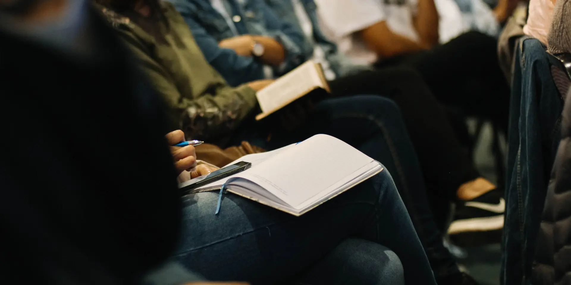 Un groupe de personnes écoute attentivement une conférence tout en prenant des notes.