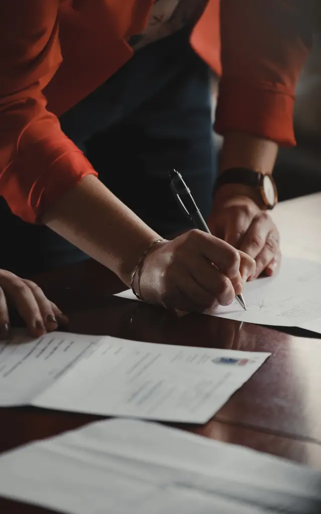 Deux personnes signent des documents officiels, symbolisant un accord ou un engagement.