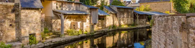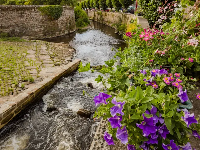 Un couple profite de la tranquillité d'un canal dans un village pittoresque.