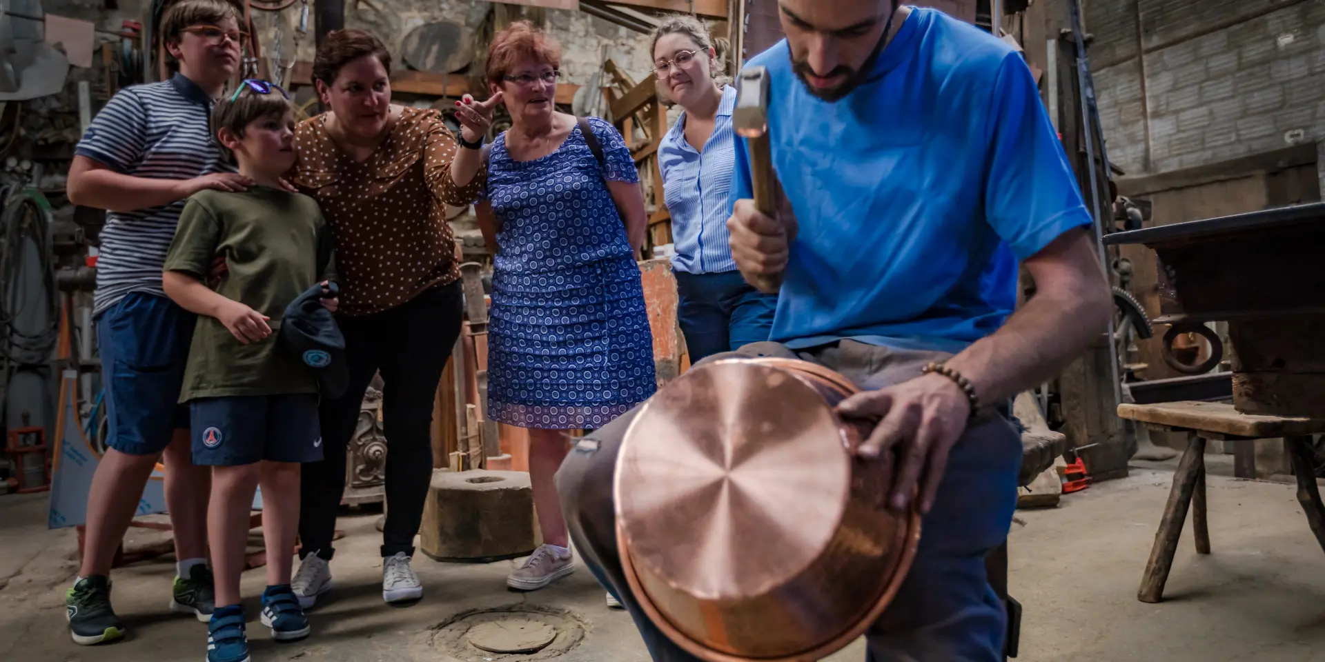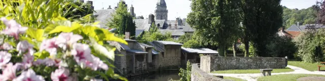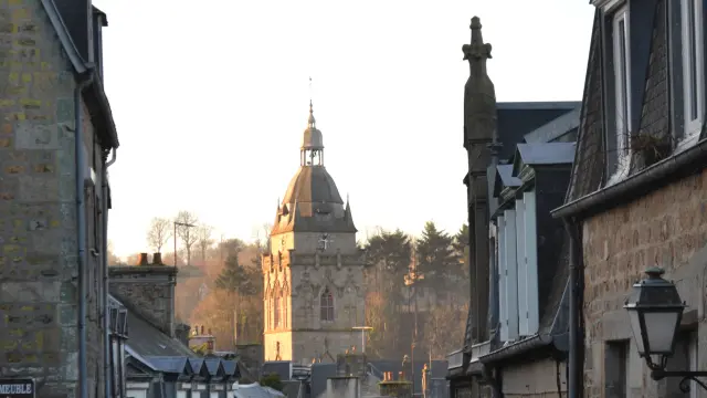 Une rue pavée pittoresque menant à une église historique à Villedieu les poêles