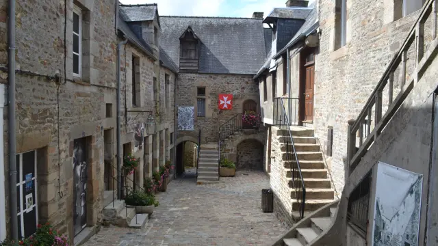 Une rue pavée pittoresque avec des bâtiments en pierre et des escaliers menant à des entrées.