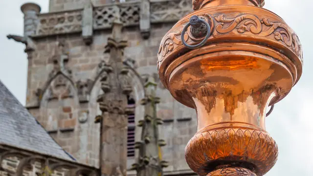 La tour d'horloge gothique se dresse majestueusement avec son finial en cuivre brillant.