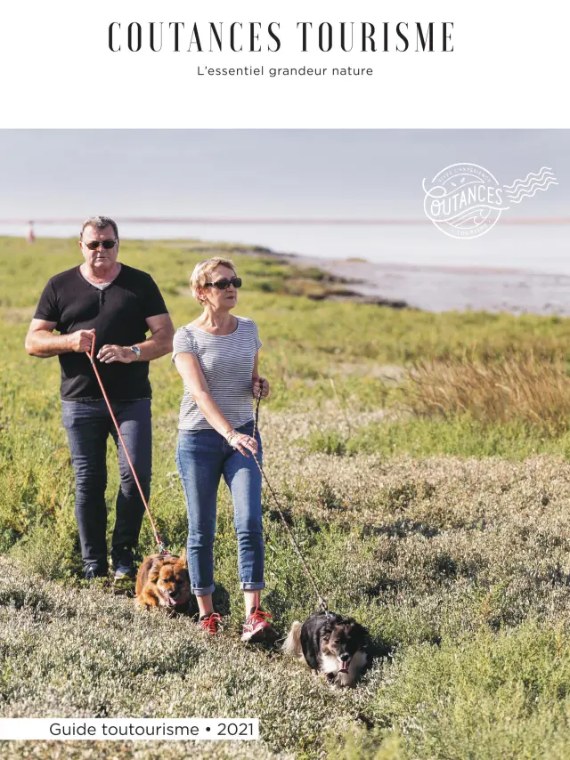 Deux personnes marchent sur une plage herbeuse avec leurs deux chiens. L'océan est visible en arrière-plan. Les personnes portent des vêtements décontractés et des lunettes de soleil. Le texte 'COUTANCES TOURISME' et 'Guide toutourisme • 2021' est visible.