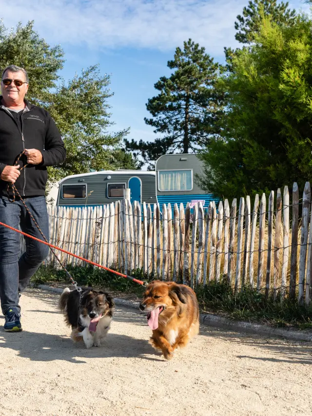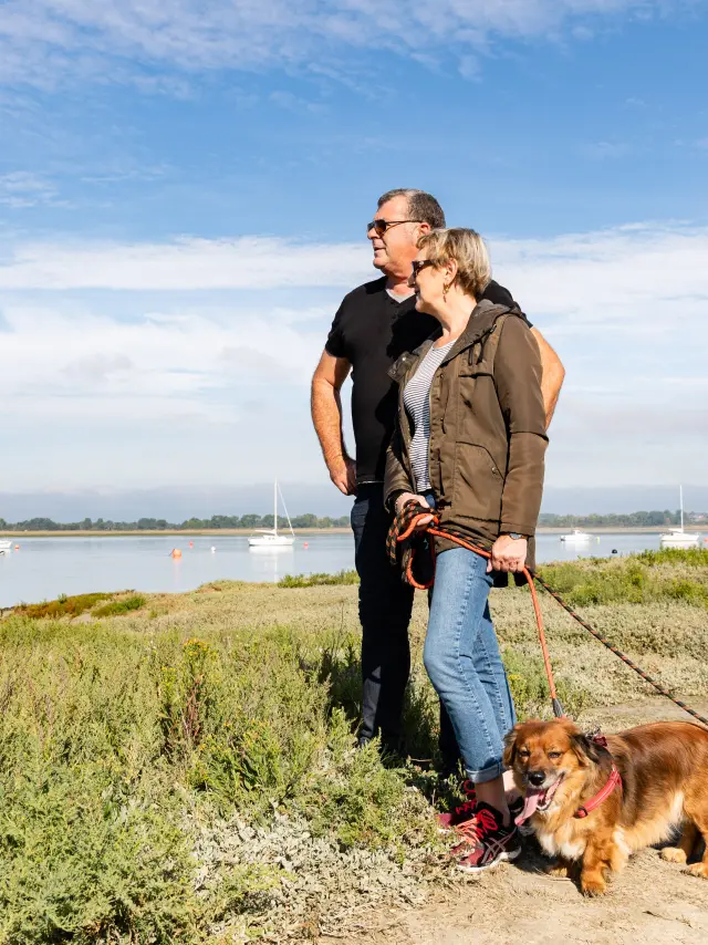 Deux personnes marchent sur un chemin près d'un plan d'eau, accompagnées d'un chien. Le paysage est composé de végétation et de bateaux au loin. Le ciel est partiellement nuageux.