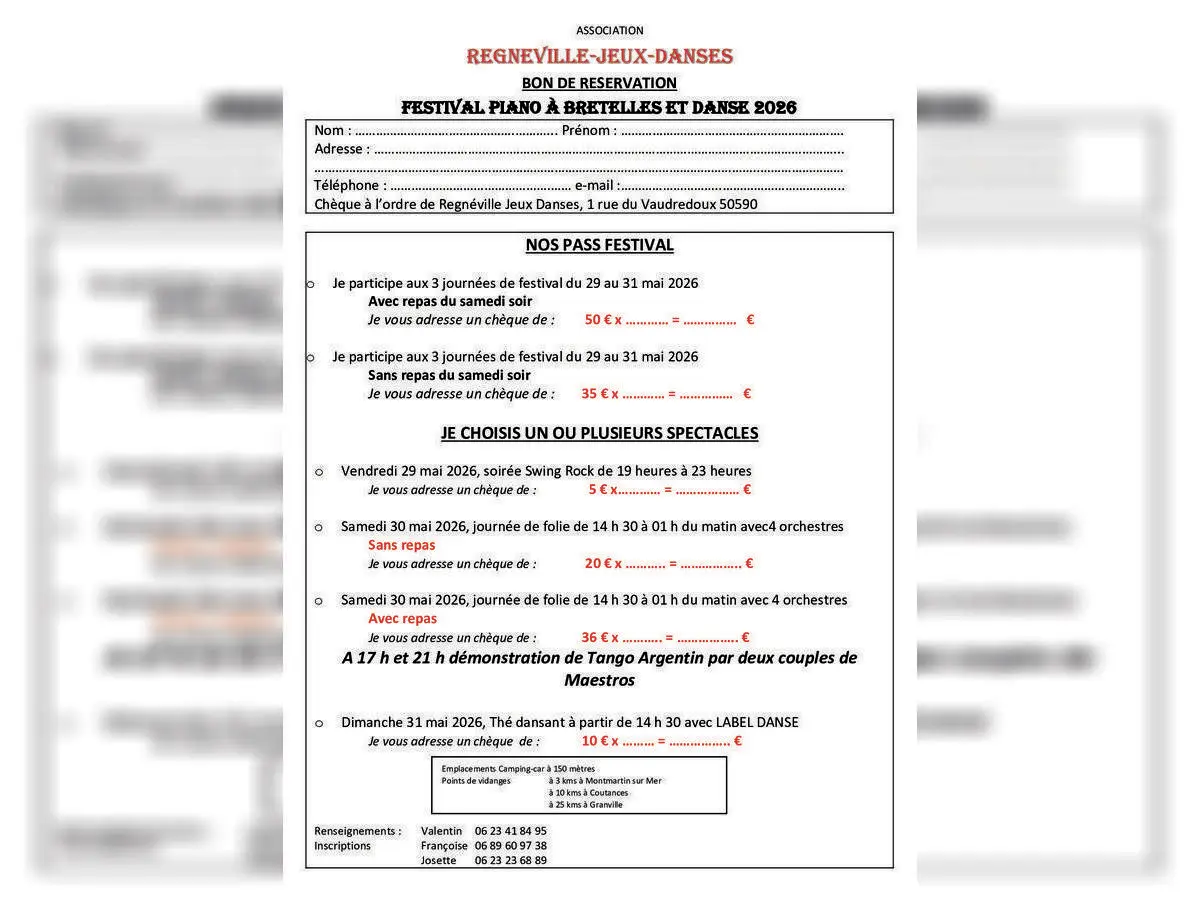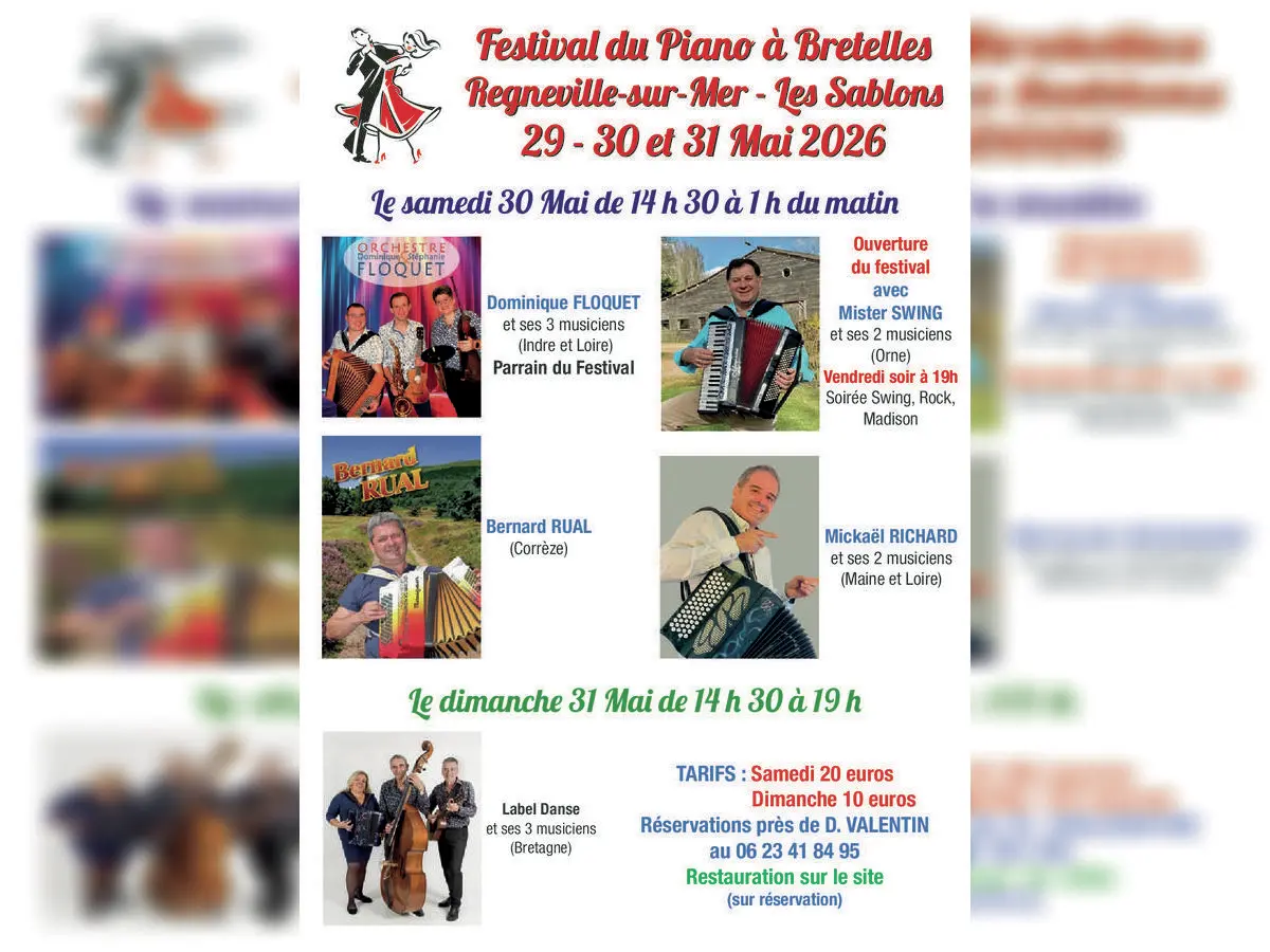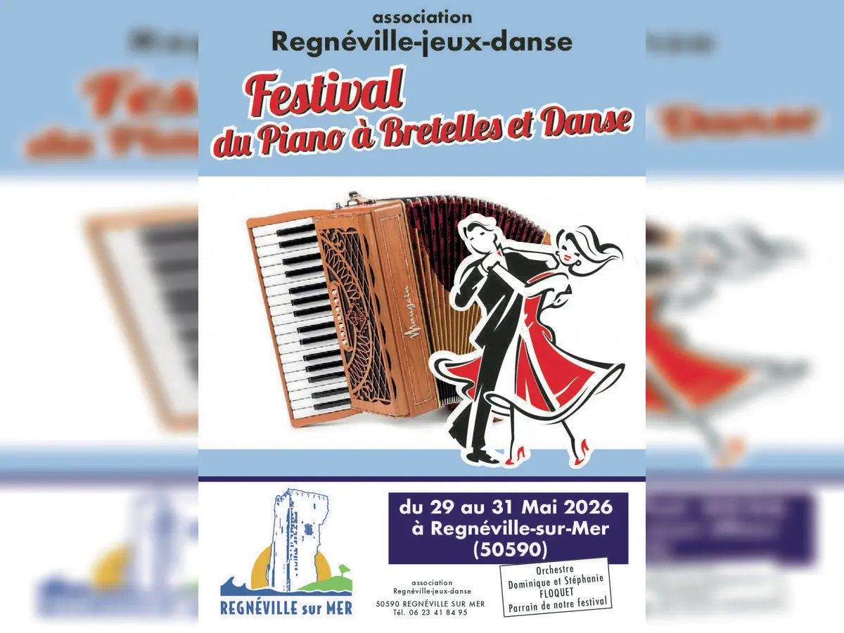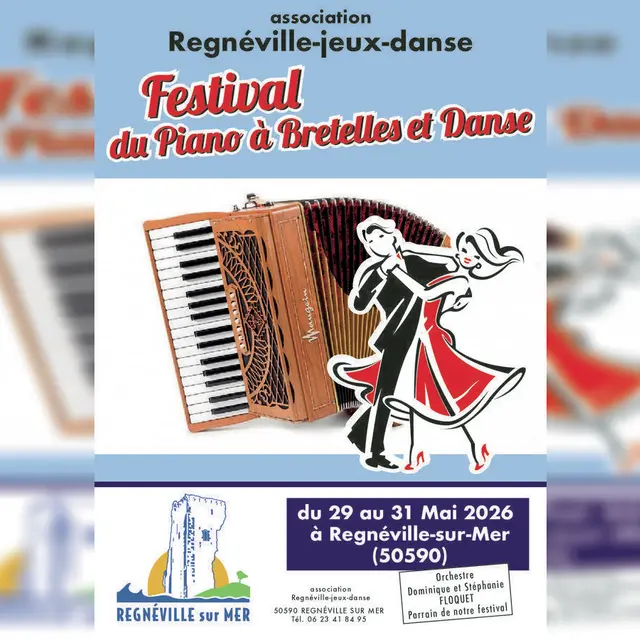 Festival du Piano à Bretelles et Danse — Les Sablons, Regnéville-sur-Mer Du 29 au 31 mai Trois jours de fête, d'accordéon et de danse sous chapiteau aux Sablons de Regnéville-sur-Mer ! Le Festival du Piano à Bretelles réunit le temps d'un long week-end de nombreux orchestres venus de toute la France pour faire vibrer les planches et chauffer les danseurs de tous niveaux. • Vendredi 29 mai — 19h à 23h Coup d'envoi avec une soirée swing, rock et madison animée par Mister Swing et ses 2 musiciens (Orne). De quoi mettre tout de suite l'ambiance ! • Samedi 30 mai — 14h30 à 1h La grande journée avec pas moins de 4 orchestres au programme : Dominique Floquet et ses 3 musiciens, parrain du festival (Indre-et-Loire), Mister Swing et ses 2 musiciens (Orne), Bernard Rual (Corrèze) et Mickaël Richard et ses 2 musiciens (Maine-et-Loire). La journée est ponctuée d'une démonstration de tango argentin pour le plaisir des yeux. • Dimanche 31 mai — 14h30 à 19h Clôture en douceur avec un thé dansant animé par Label Danse et ses 3 musiciens (Bretagne). Restauration sur place sans réservation le vendredi soir, le samedi midi et le dimanche midi. Le samedi soir sur réservation — bon de réservation disponible pour les 3 journées.