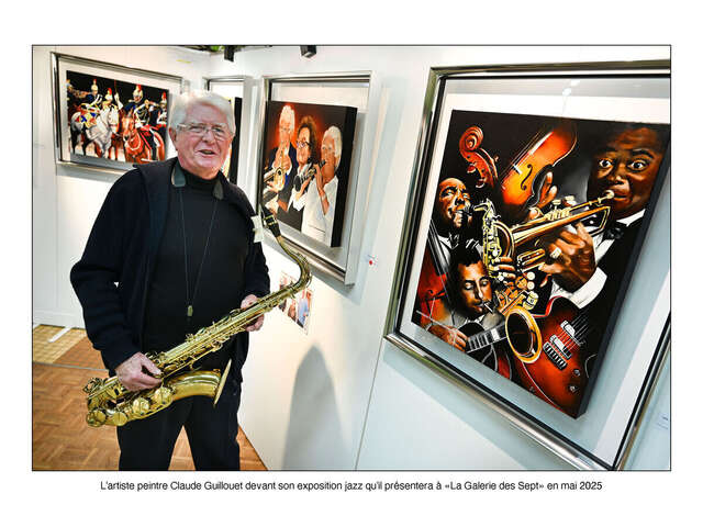 Une galerie d'art moderne avec des peintures accrochées aux murs blancs. Le sol est en marbre poli, reflétant les œuvres d'art. La lumière naturelle entre par une grande porte vitrée au fond de la pièce. Les murs sont décorés avec des peintures de différentes tailles et styles, et le plafond est équipé de spots pour éclairer les œuvres.Agenda