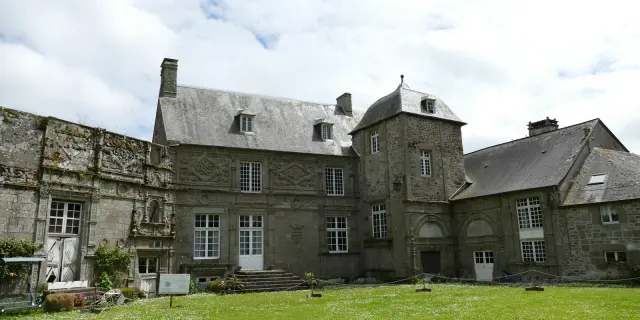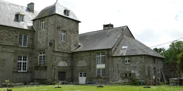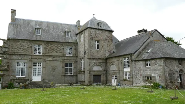 Ce manoir de pierre, avec ses fenêtres à meneaux et son toit en ardoise, est un exemple d'architecture historique.