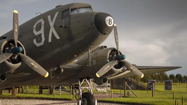 Un avion militaire historique exposé dans un parc, entouré d'une pelouse verte.