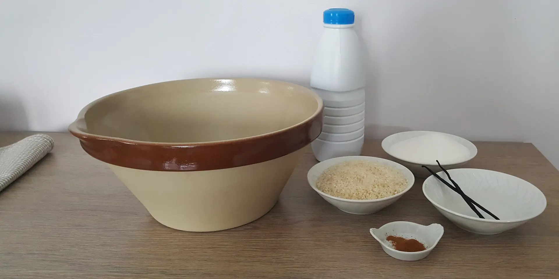 Dans une grande terrine en terre cuite, mettez le riz rond. Ajoutez le sucre en poudre et la cannelle et mélangez le tout à l’aide d’une spatule.