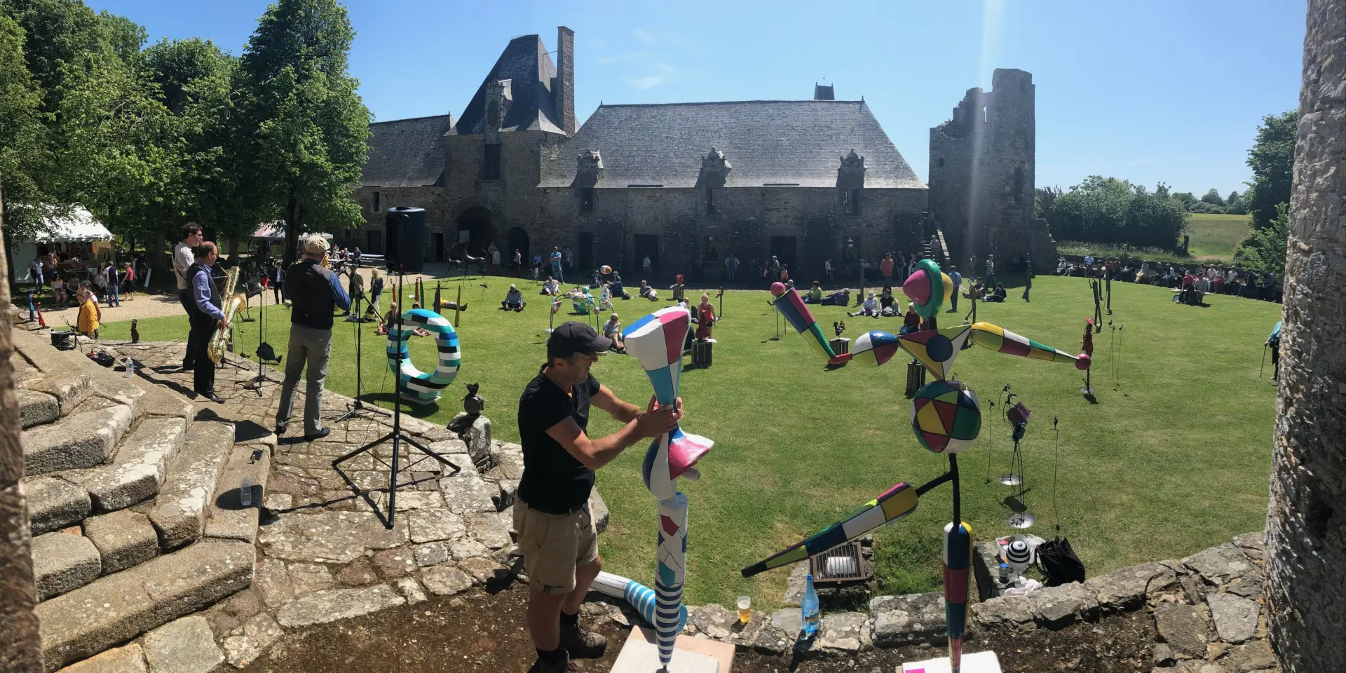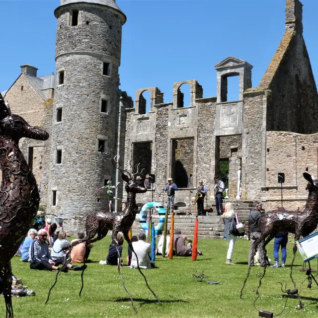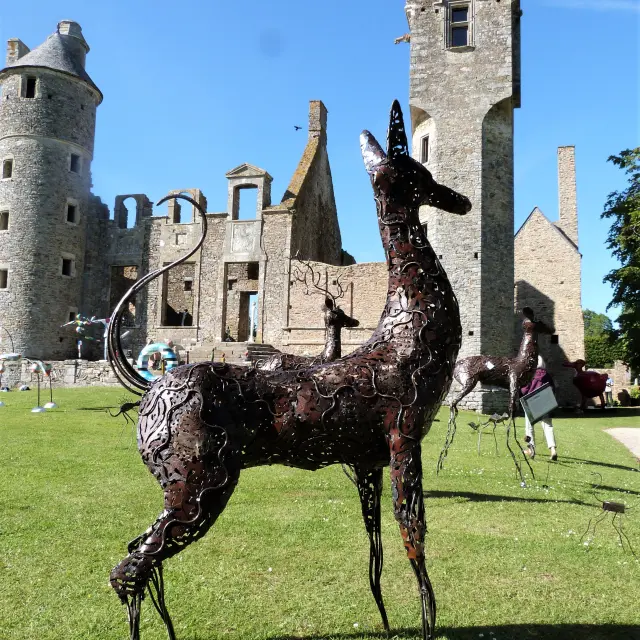 Des visiteurs admirent des sculptures de cerfs en métal devant un château en ruines.