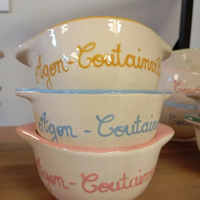 La boutique vous propose des bols à oreilles en poterie culinaire, inspirés des villes emblématiques de Coutances mer et bocage.